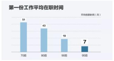 領英的《第一份工作趨勢洞察》顯示,70后的第一份工作平均超過4年才換,80后是3年半,90后是19個月,而95后則驟降到7個月。